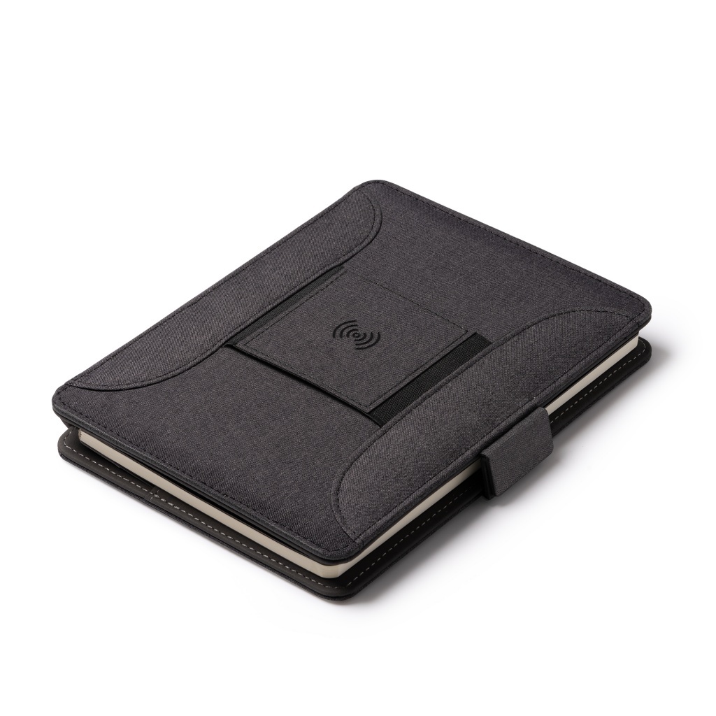 Teczka wyposażona jest w magnetyczne zamknięcie, które zabezpiecza dokumenty i przedmioty w środku. W okładce znajduje się bezprzewodowa ładowarka umożliwiająca wygodne ładowanie urządzeń kompatybilnych z technologią ładowania bezprzewodowego. Wewnątrz znajduje się wyjmowany notatnik zawierający 56 arkuszy oraz przegródka na telefon, zapewniająca jego ochronę i łatwy dostęp. W komplecie będą również uchwyty na kartę i telefon.