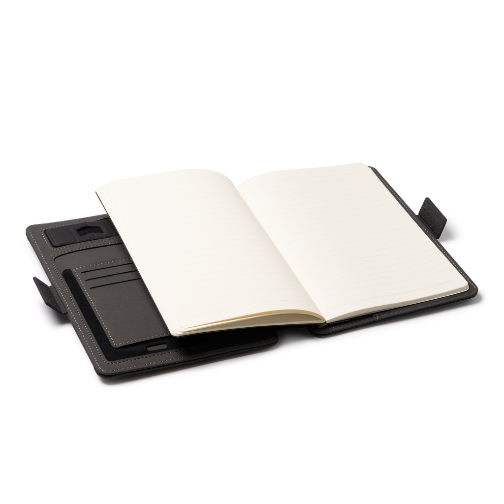 Teczka wyposażona jest w magnetyczne zamknięcie, które zabezpiecza dokumenty i przedmioty w środku. W okładce znajduje się bezprzewodowa ładowarka umożliwiająca wygodne ładowanie urządzeń kompatybilnych z technologią ładowania bezprzewodowego. Wewnątrz znajduje się wyjmowany notatnik zawierający 56 arkuszy oraz przegródka na telefon, zapewniająca jego ochronę i łatwy dostęp. W komplecie będą również uchwyty na kartę i telefon.