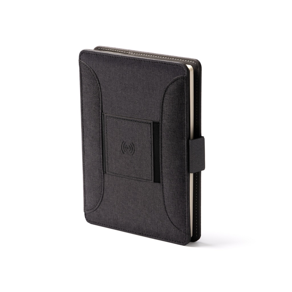 Teczka wyposażona jest w magnetyczne zamknięcie, które zabezpiecza dokumenty i przedmioty w środku. W okładce znajduje się bezprzewodowa ładowarka umożliwiająca wygodne ładowanie urządzeń kompatybilnych z technologią ładowania bezprzewodowego. Wewnątrz znajduje się wyjmowany notatnik zawierający 56 arkuszy oraz przegródka na telefon, zapewniająca jego ochronę i łatwy dostęp. W komplecie będą również uchwyty na kartę i telefon.
