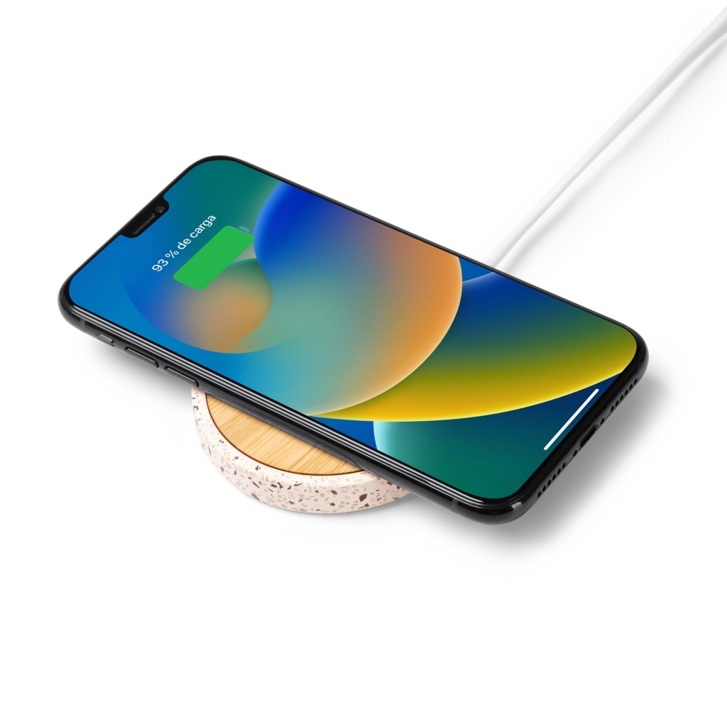 Bezprzewodowa ładowarka z obudową wykonaną z bambusa oraz lastriko pochodzącego z recyklingu.