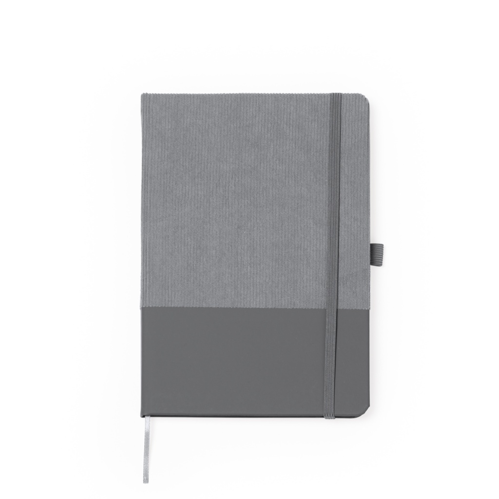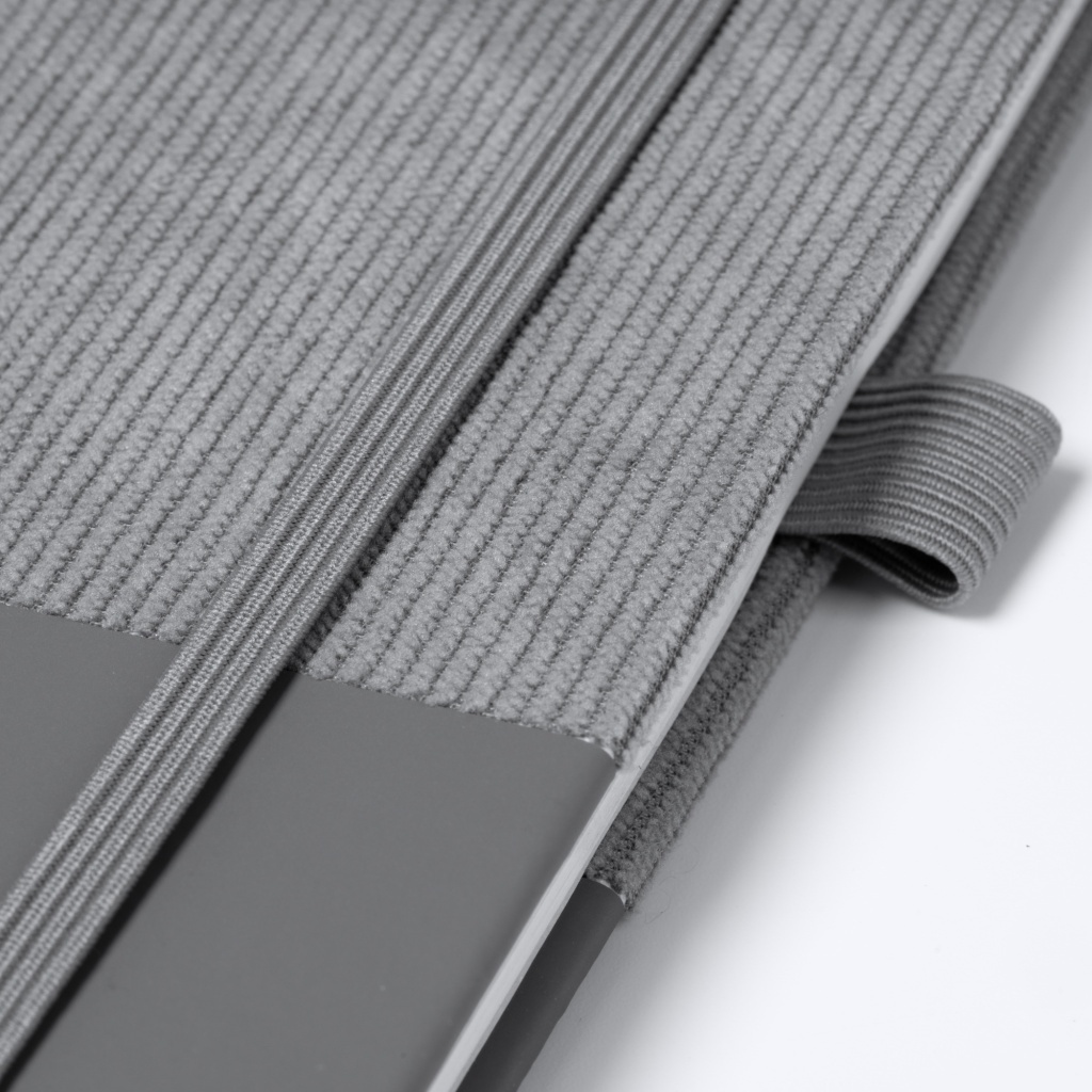 Notatnik w formacie A5 z okładką ze sztruksu i skóry PU. Zawiera 80 kartek w linie.