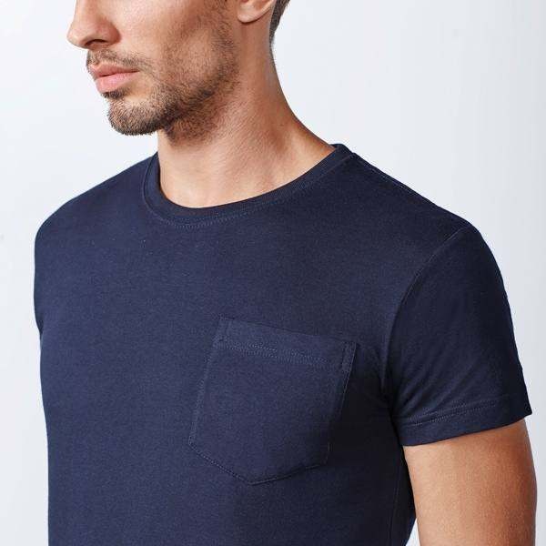 Koszulka z kieszonką. Czterowarstwowy, okrągły kołnierz. Wzmocnione, kryte szwy przy kołnierzyku i na ramionach. Szwy boczne.