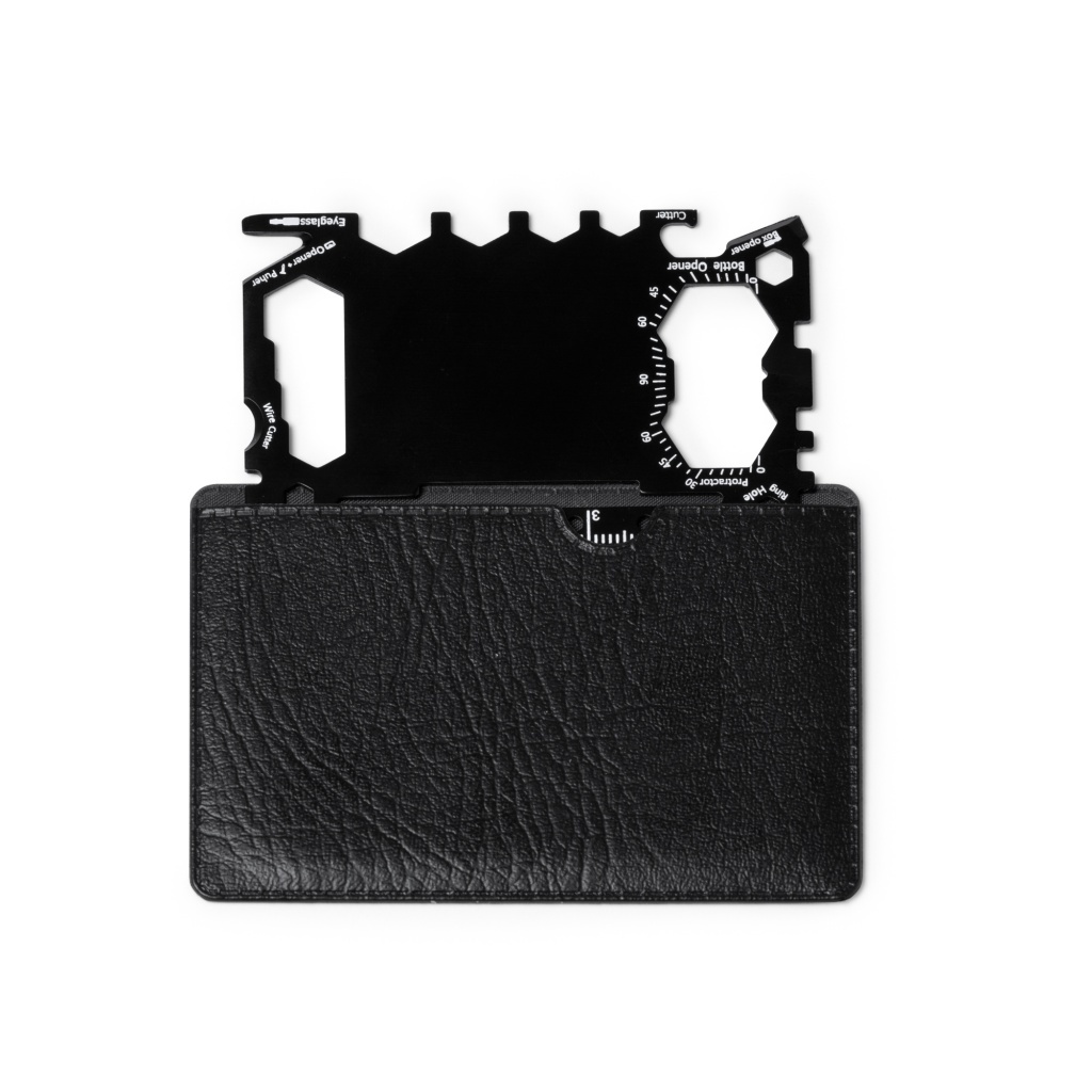 Narzędzie wielofunkcyjne ze stali nierdzewnej, wyposażone w 17 wbudowanych funkcji. Kompaktowe narzędzie obejmuje: otwieracz do puszek, ostry nóż, śrubokręt, linijkę, otwieracz do butelek, klucz nastawny, klucz motylkowy, piłę, kierunkowskaz i kątomierz. Produkt zapakowany w etui wykonane z PU.