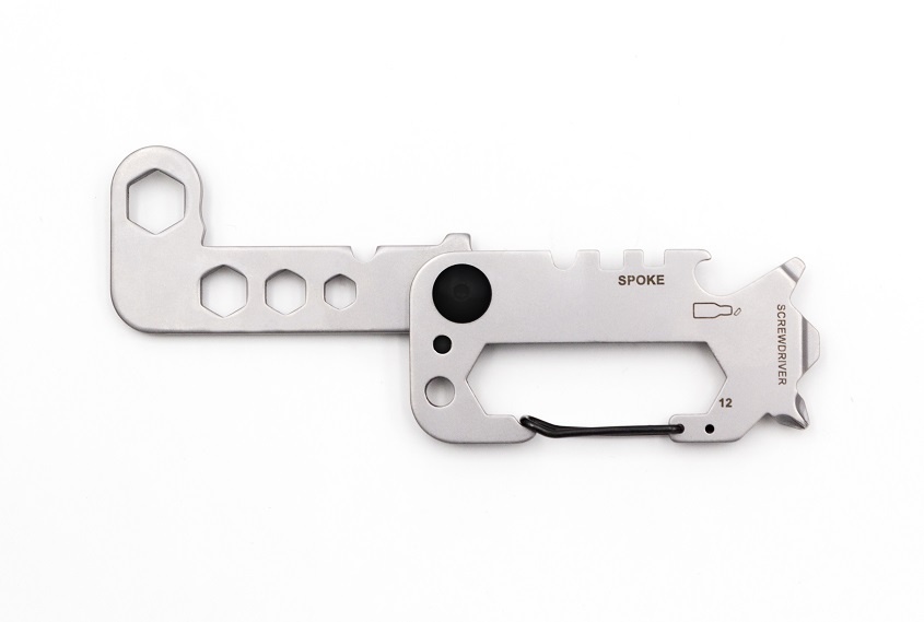 TWIST — praktyczny zestaw 8 narzędzi w eleganckim, rozkładanym breloku (przecinak do drutu, klucz do szprych rowerowych, klucze w rozmiarach 5.5 / 7/8/12, śrubokręt Philips, śrubokręt płaski, linijka, otwieracz do butelek, karabińczyk) .