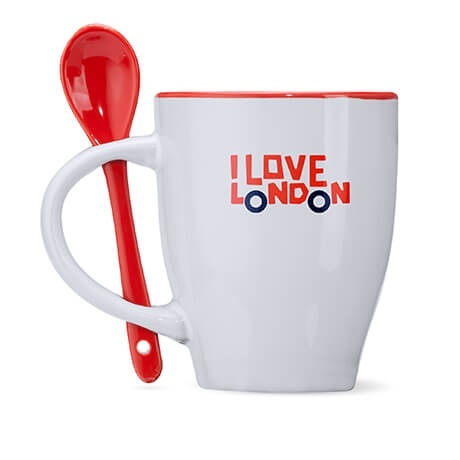 Kubek ceramiczny 350 ml z dołączoną łyżeczką wykonaną z ceramiki, dopasowaną kolorem do wnętrza kubka.