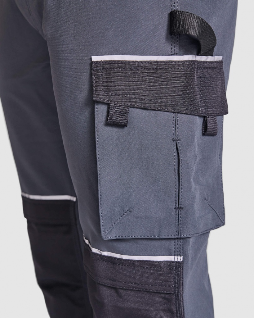 · Kieszeń na kolanach z klapą, taśmą odblaskową i zapięciem na rzep.