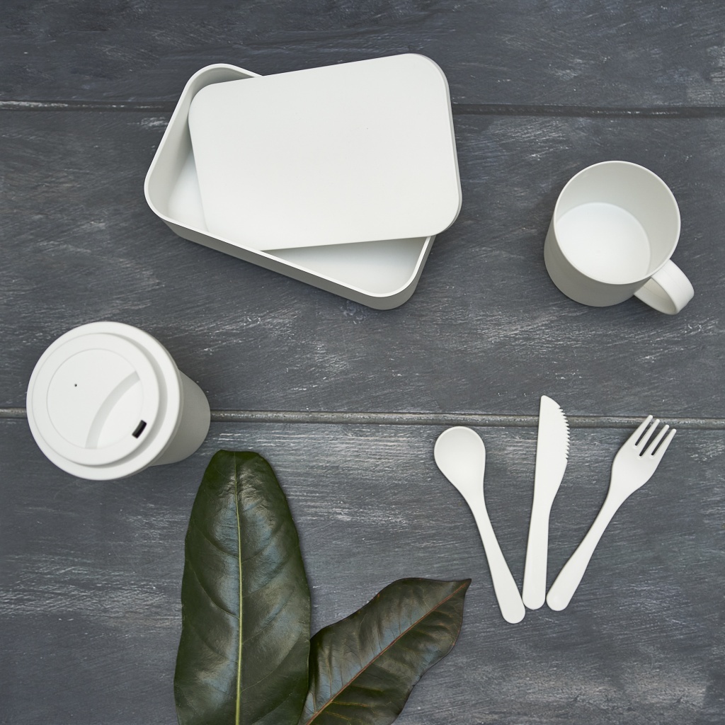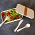 Pudełko śniadaniowe wykonane z materiału PLA, wyposażone w silikonowy pasek ściągający.