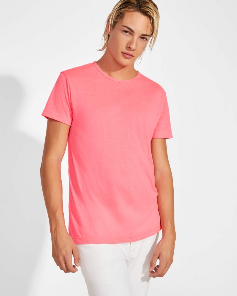 Koszulka z krótkim rękawem. Okrągły dekolt, wzmocnione kryte szwy. Fluorescencyjne kolory. Koszulka wykonana z tkaniny poliestrowej przypominającej w dotyku bawełnę.