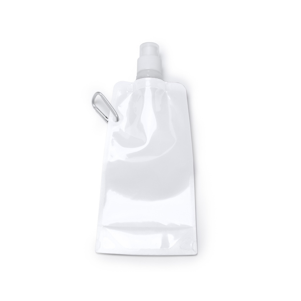 Składana butelka z zakrętką. Zawiera aluminiowy karabińczyk. Łatwa do noszenia w dłoni i zajmuje niewiele miejsca w plecaku.