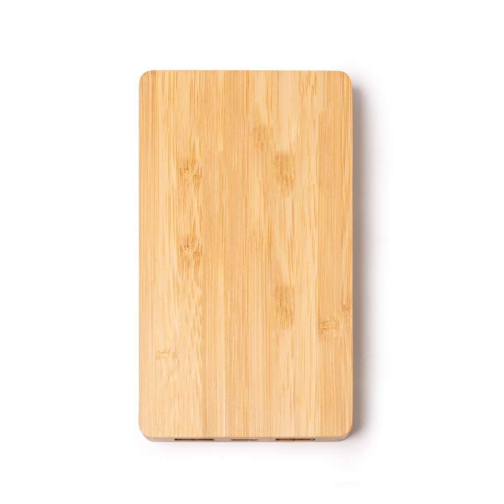 Powerbank o konstrukcji zrobionej z bambusa i podstawie z naturalnych włókien. Pojemność: 8000 mAh. Wejście USB typu C. Jeden port wyjściowy USB typu C oraz dwa porty wyjściowe USB. W zestawie znajduje się kabel. Produkt zapakowany w pudełko zaprojektowane z myślą o środowisku.